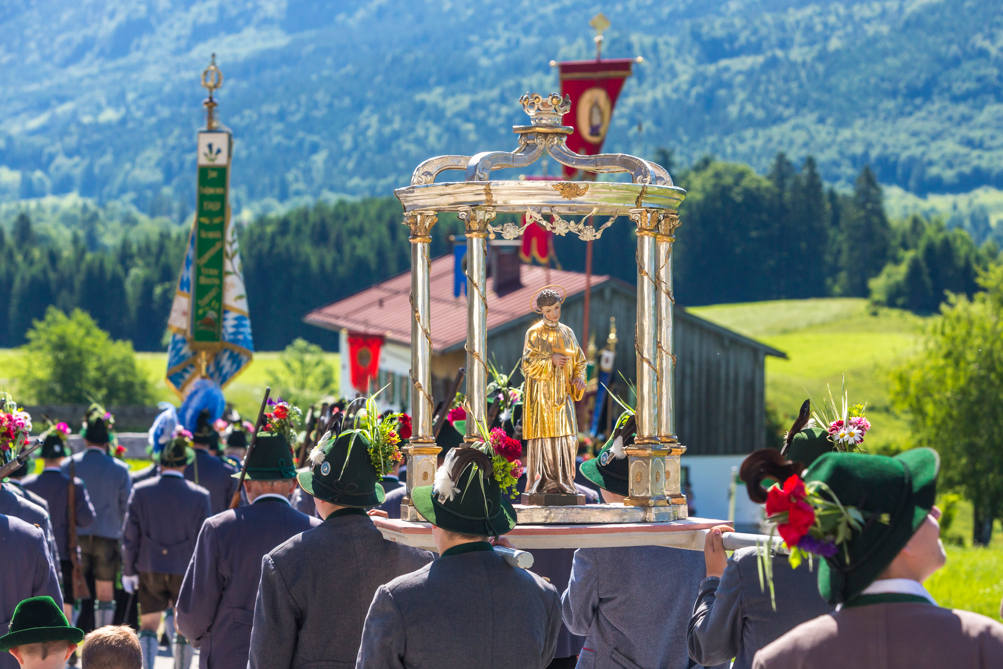 Bild zeigt Eindrücke einer Fronleichnams-Prozession in Bayern mit Jesus-Statue und traditionell gekleideten Bayern.