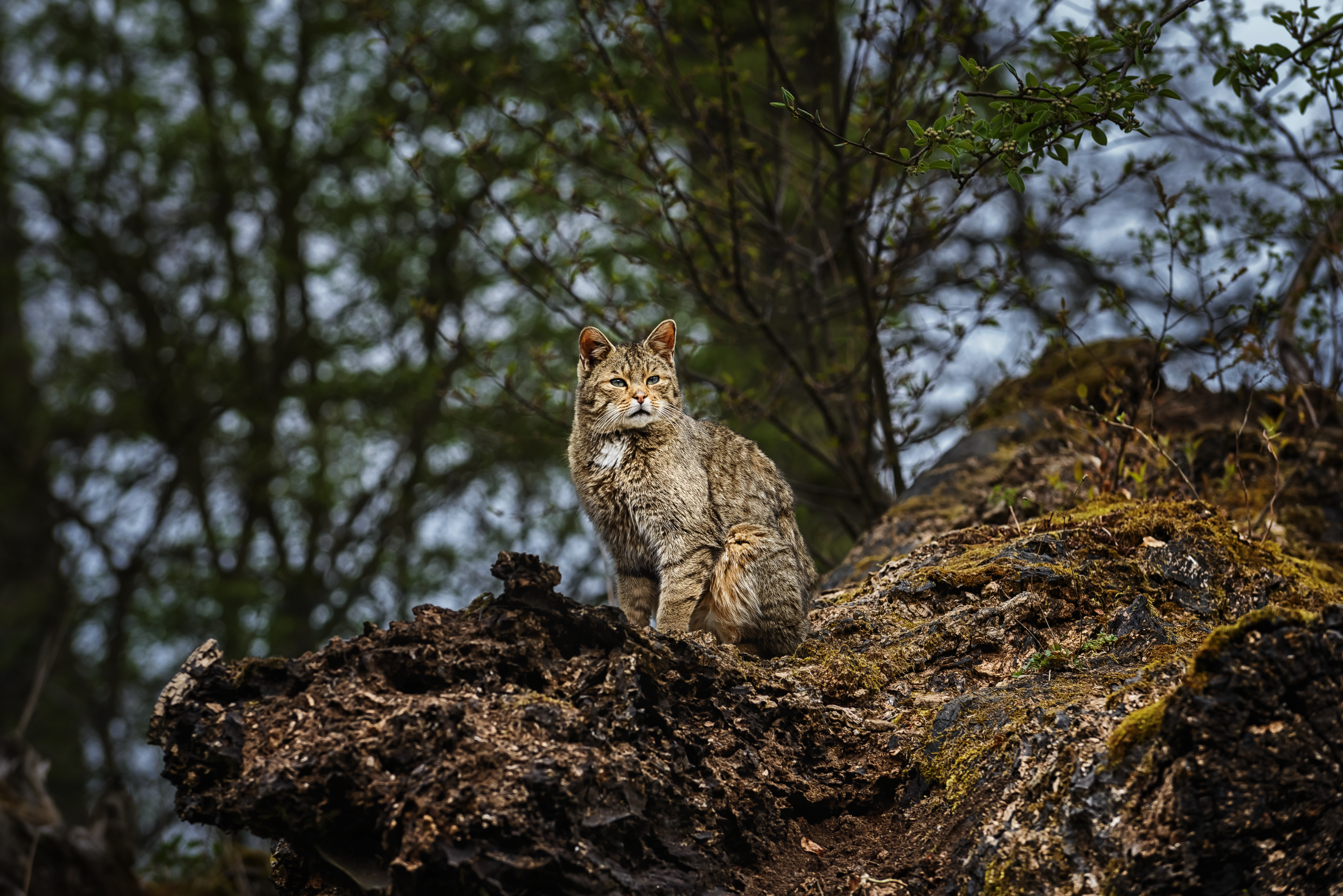 Bild zeigt eine europäische Wildkatze, die auf einem Felsen mitten im Wald sitzt..