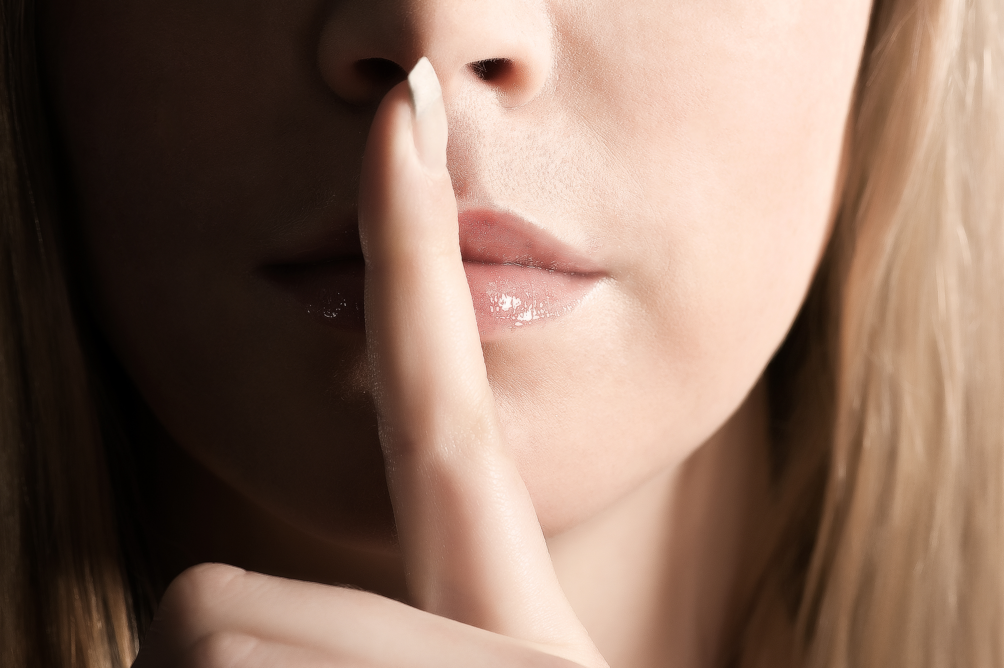 Bild zeigt den Mund einer Frau, die gerade "pssst" sagt und dabei mit den Fingern und dem Mund um Ruhe bittet.