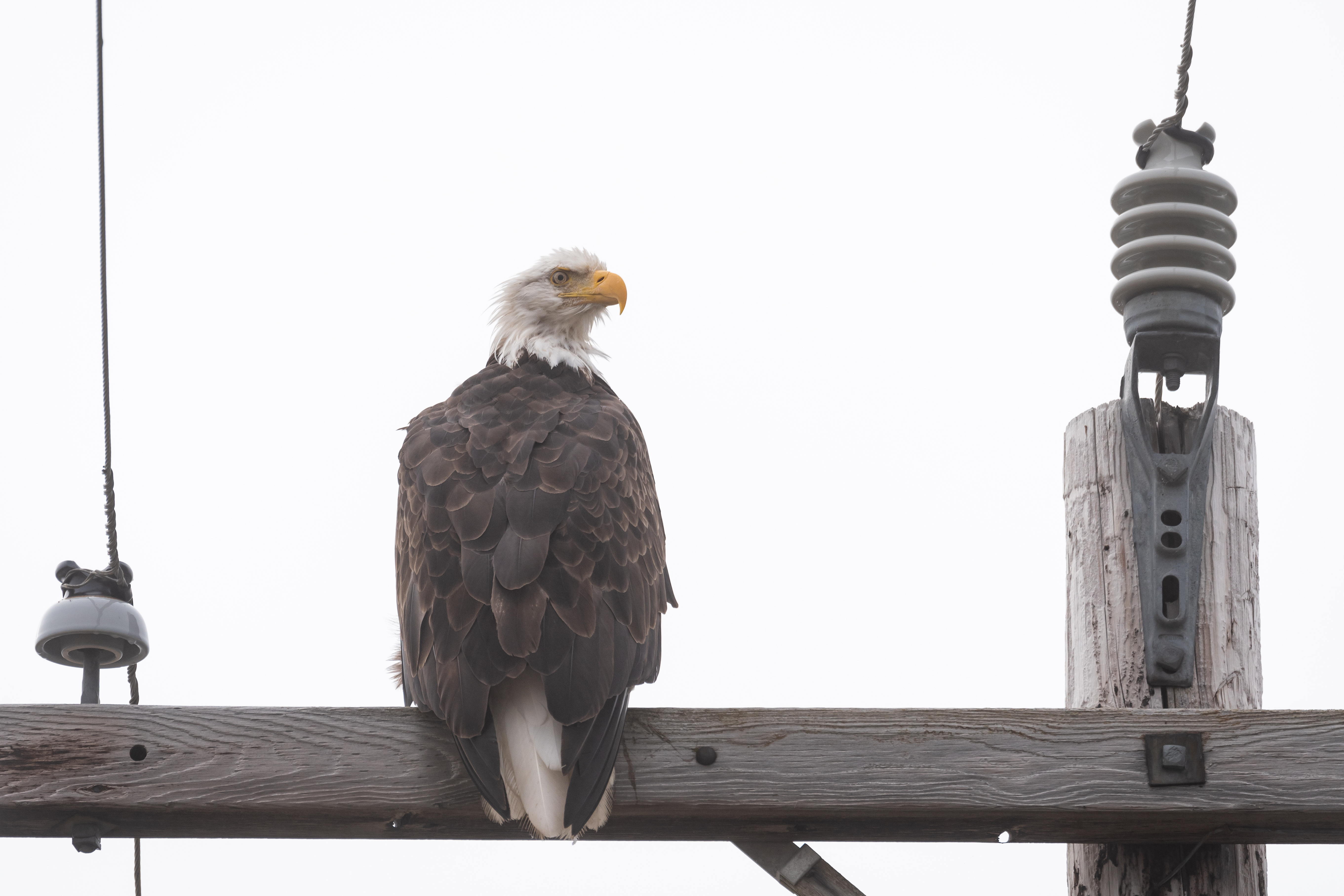 Bild zeigt einen Adler, der auf einem Strommasten sitzt. Auf einer Stromleitung soll er lieber nicht sitzen.
