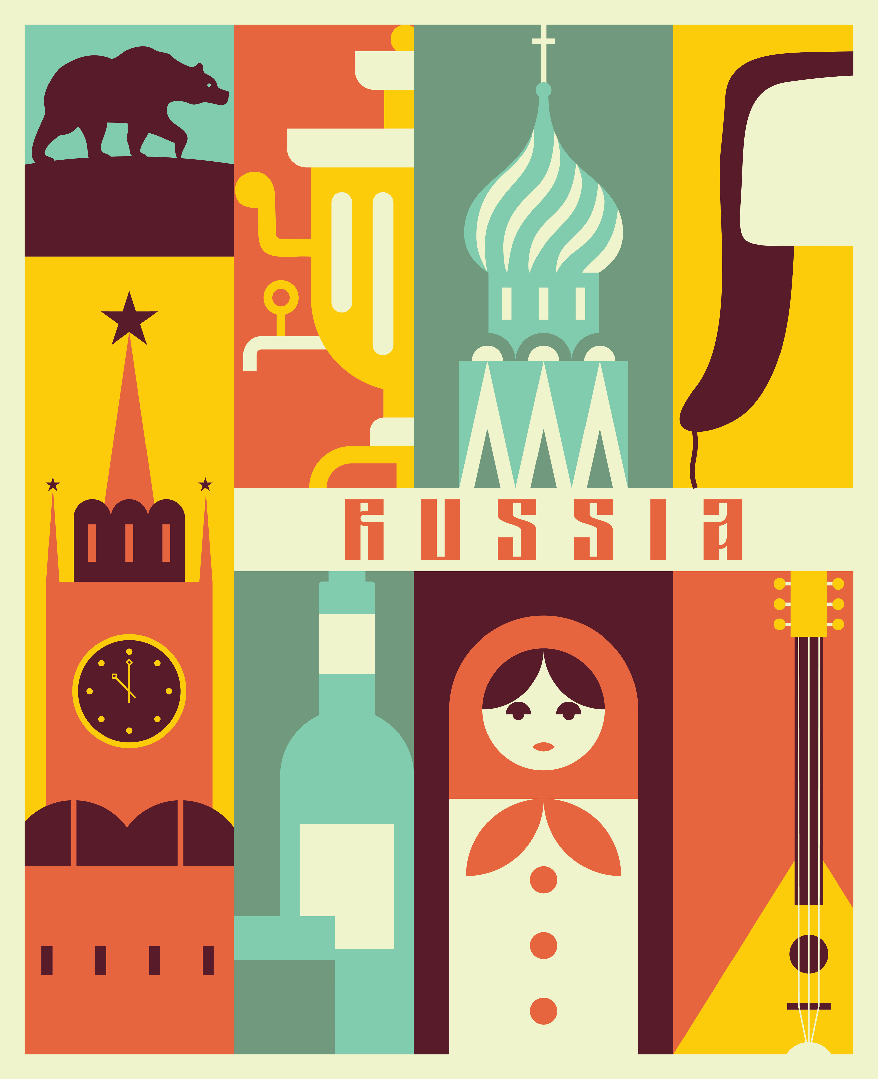 Bild zeigt einige Symbole aus Russland wie z.B. orthodoxe Kirchtürme, Vodka, Bär, Matrjoschka-Puppen....