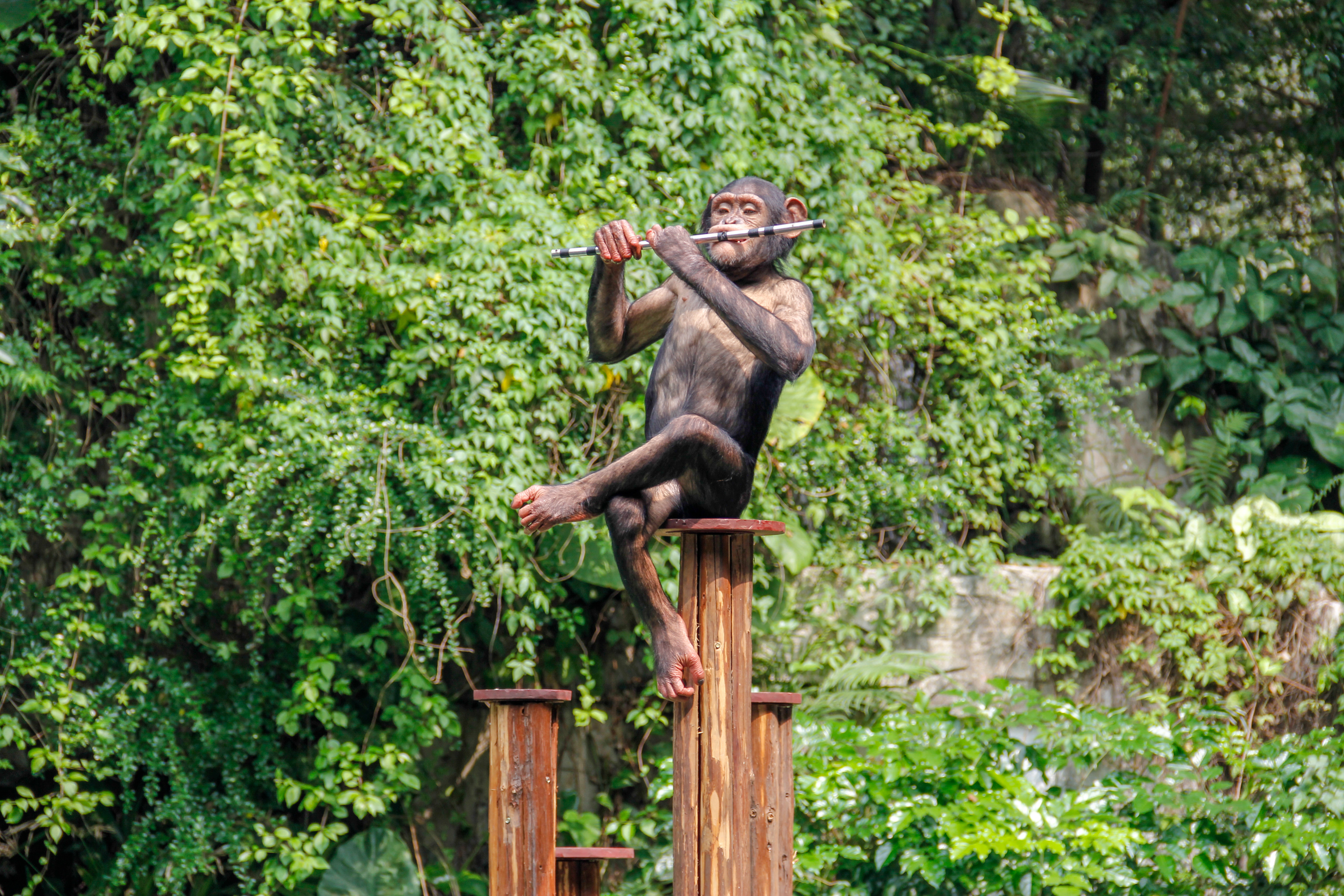 Bild zeigt einen Schimpansen im Zoo, der vermeintlich mit einer Flöte spielt.