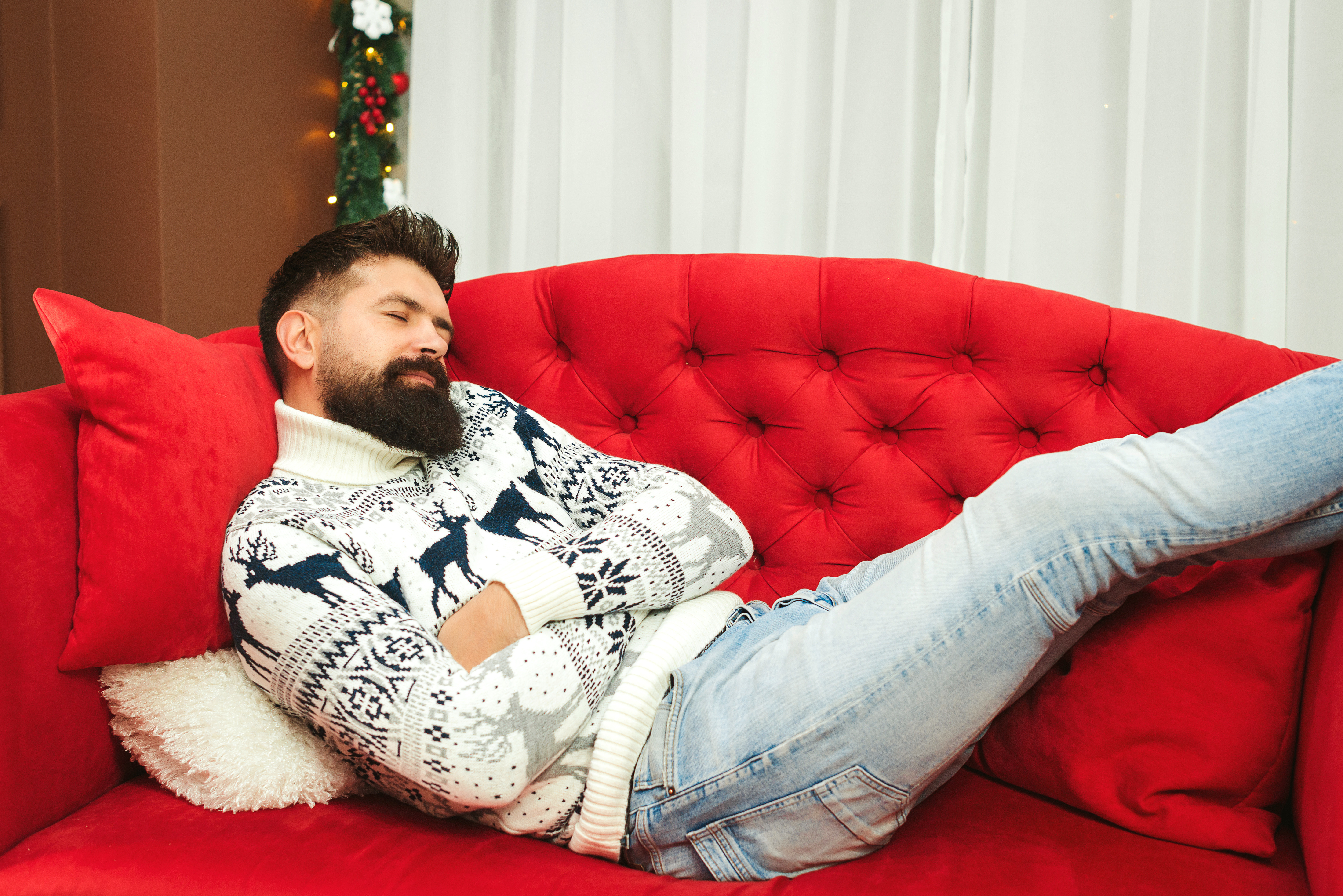 Bild zeigt einen Mann, der auf einer roter Couch liegt und etwas döst.