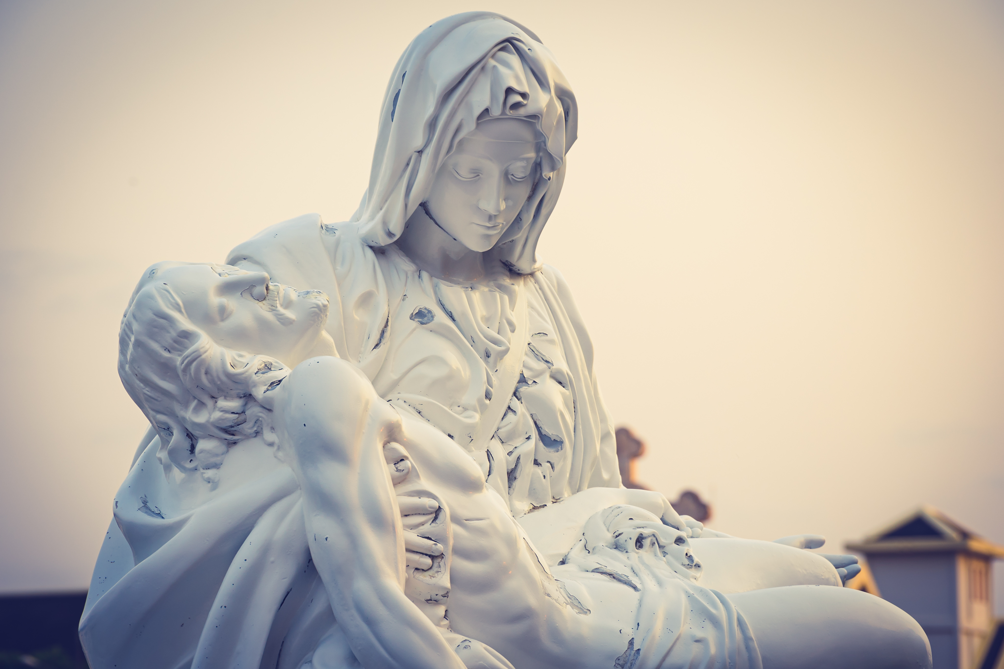 Bild zeigt zwei Statuen: Maria und Jesus. Maria trauert um ihren toten Sohn Jesus.