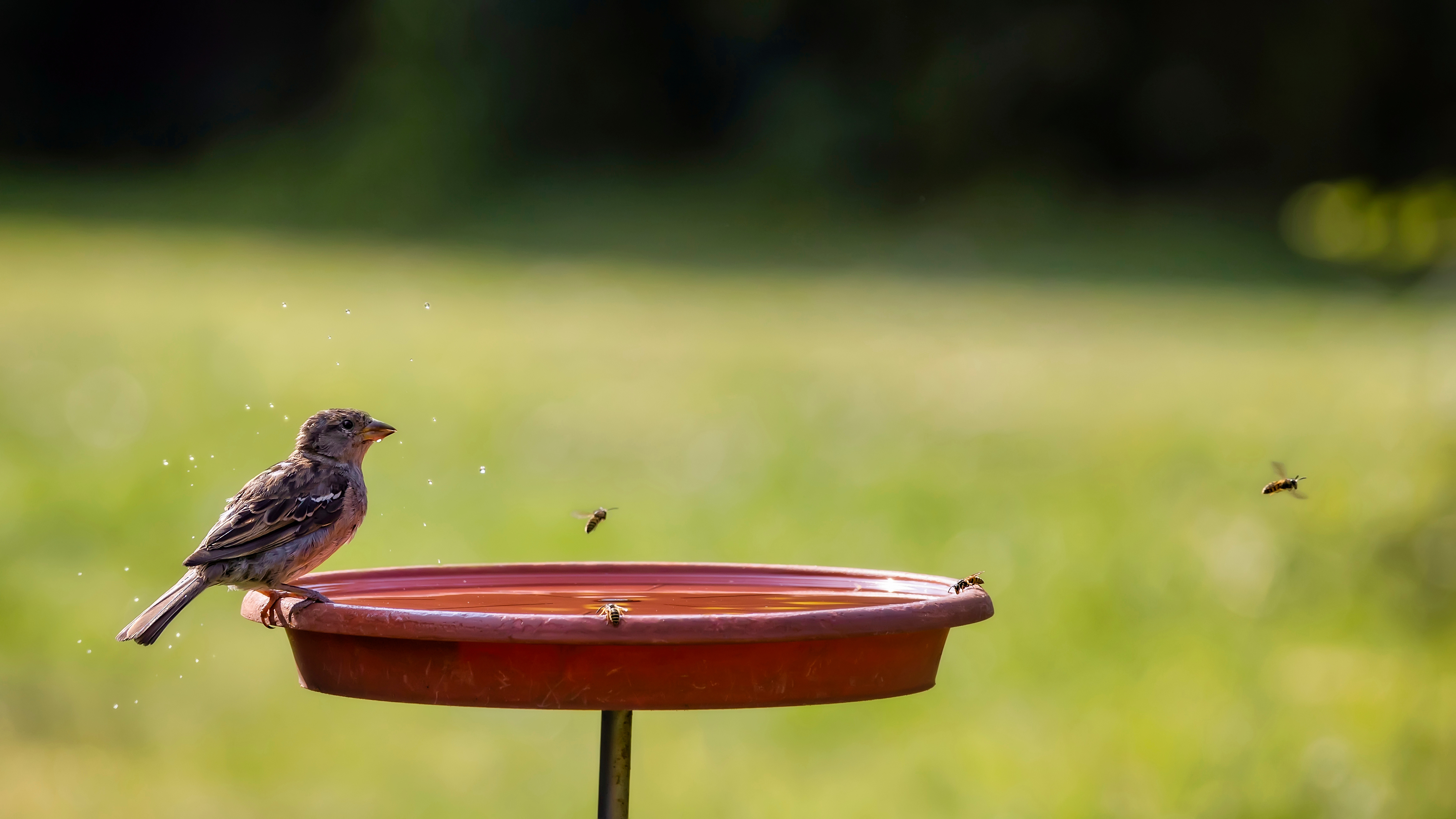 Bild zeigt einen Vogel, der aus einer Trinkstelle in einem Garten trinkt.