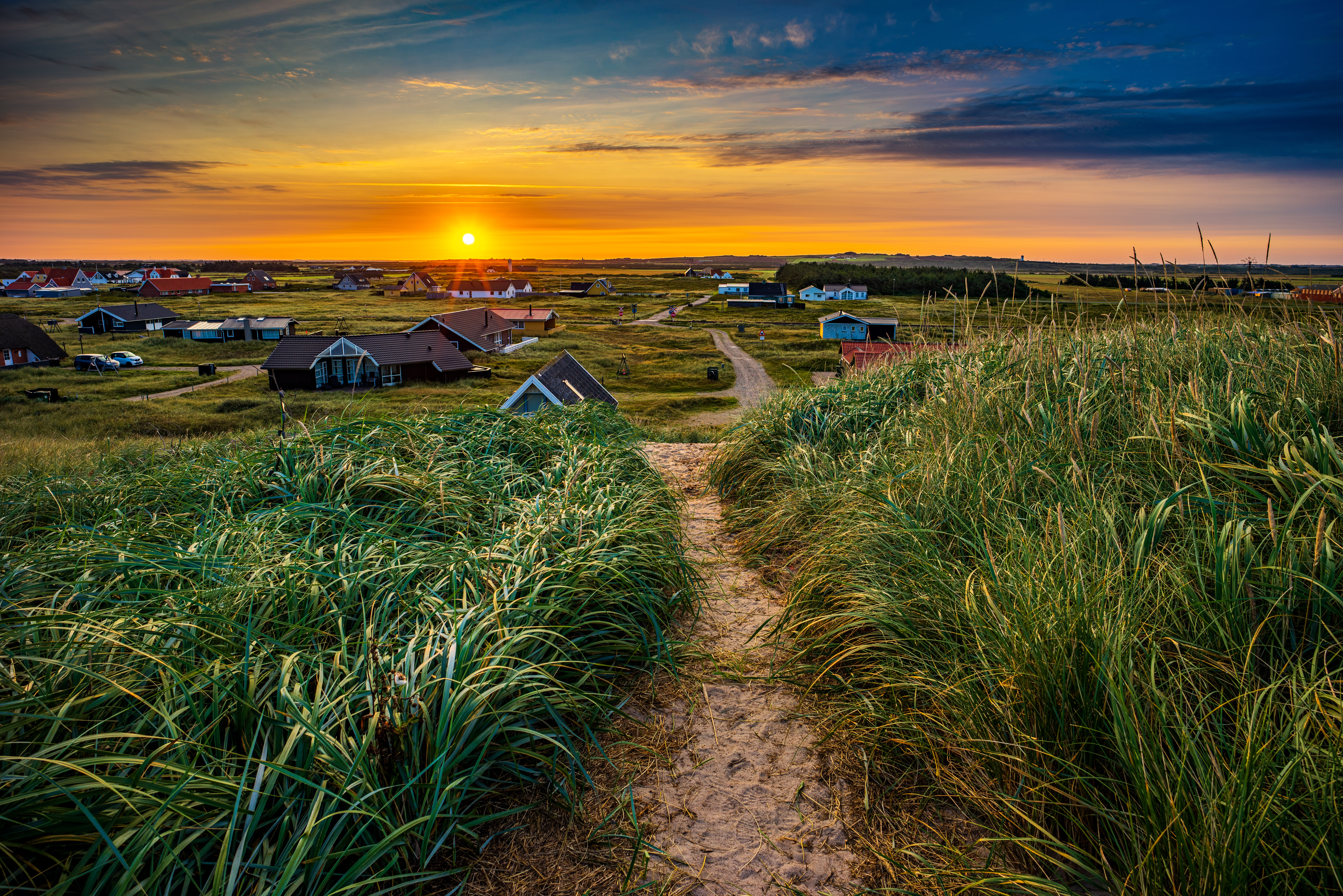Bild zeigt einen Sonnenaufgang und Ferienhäuser im Vordergrund in Vrist, Dänemark.