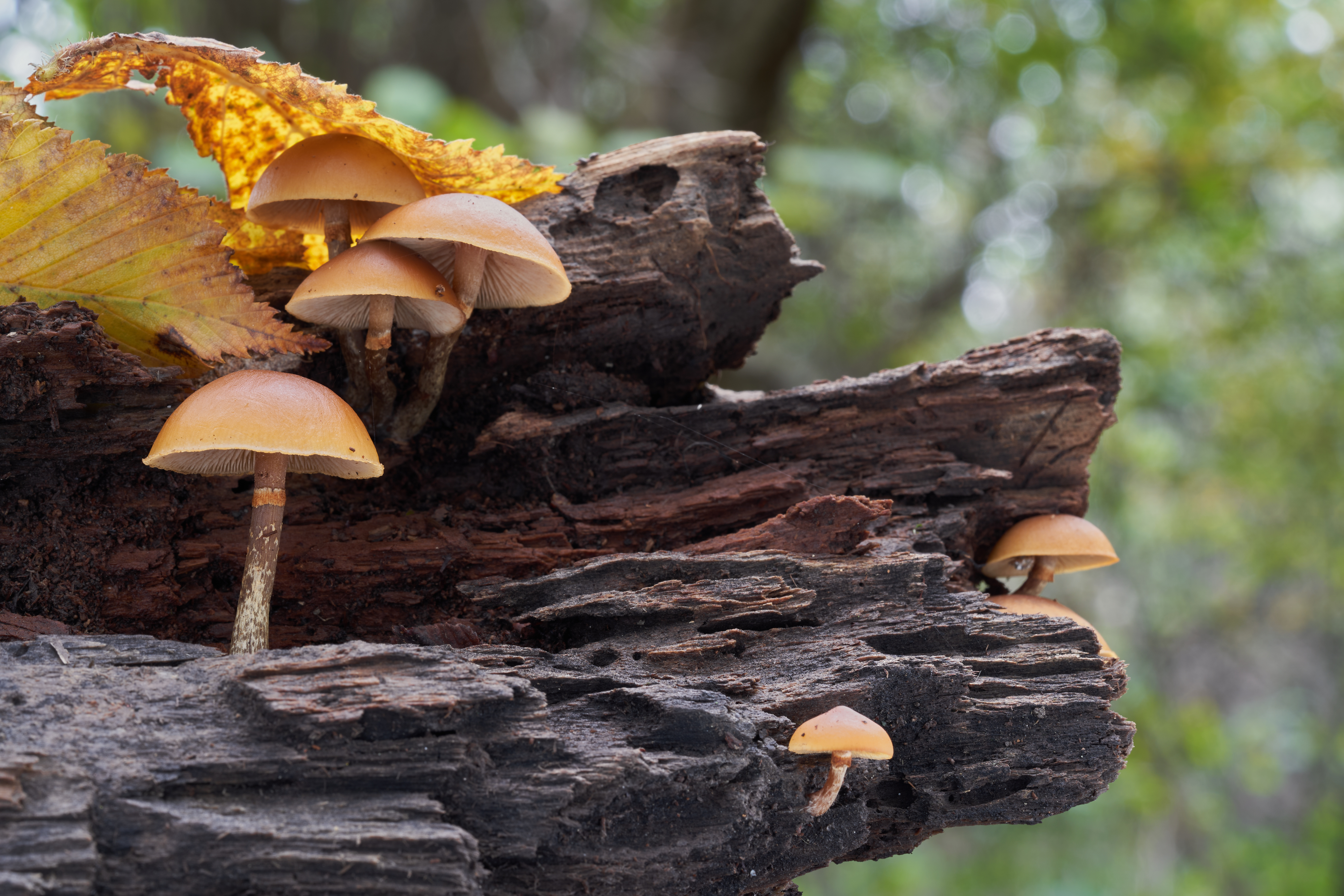 Bild zeigt mehrere Gifthäublinge, die auf einem alten Baumstamm wachsen.