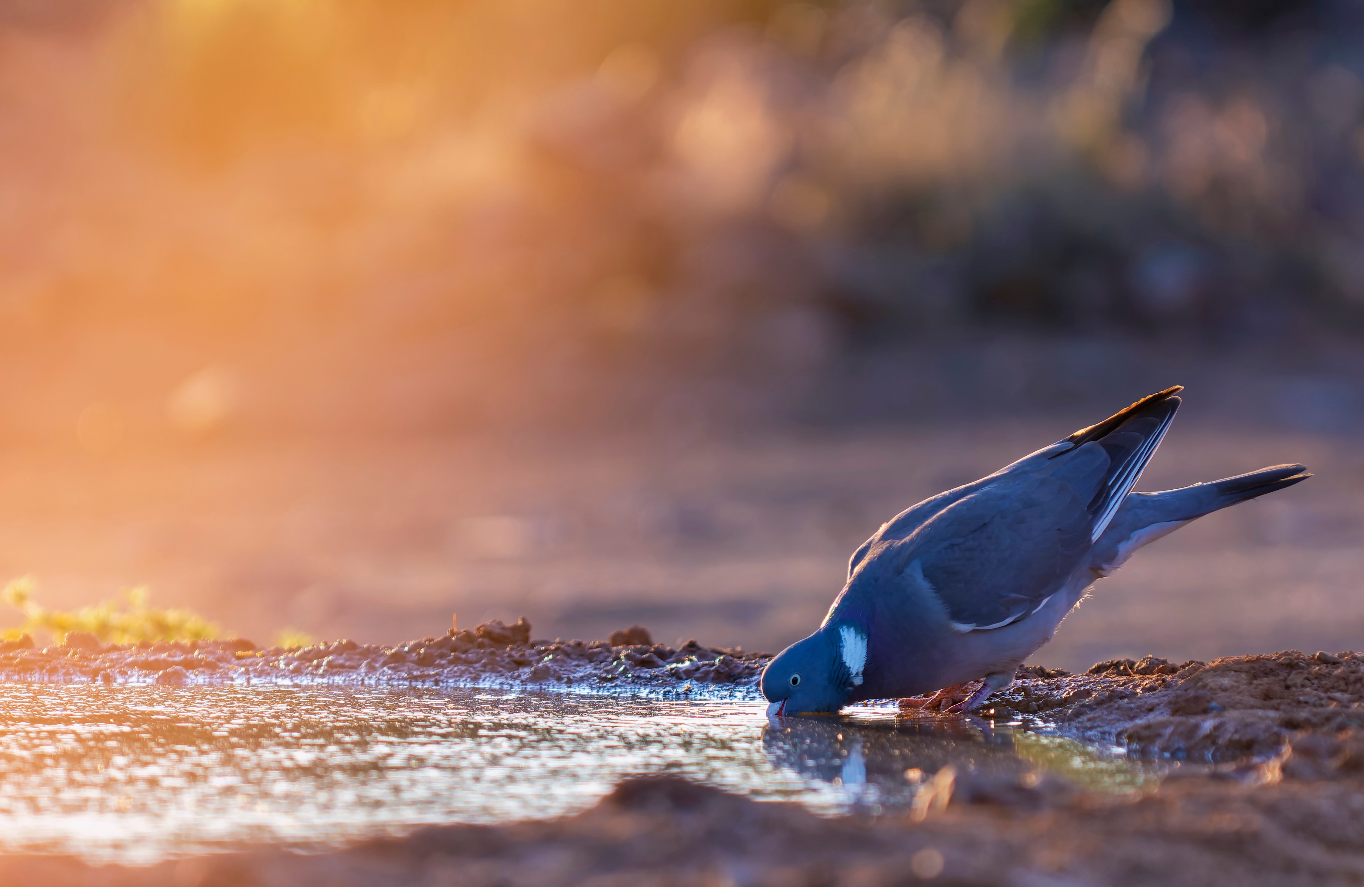 Bild zeigt eine Taube, welche gerade aus einer Pfütze trinkt.