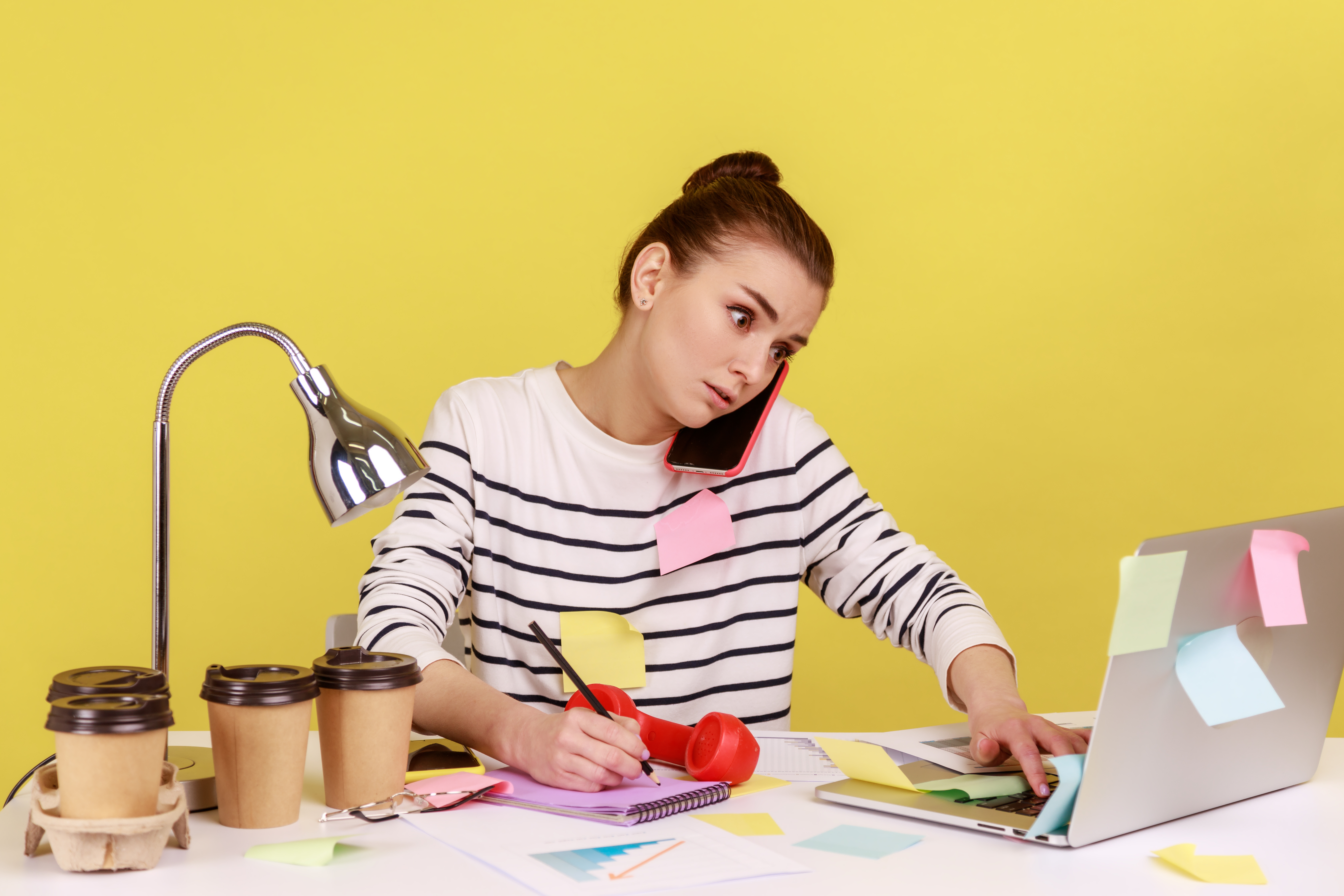 Bild zeigt eine Frau - vermutlich im Homeoffice, die mit viel Kaffee und Post-Its versucht ihren Arbeitstag zu bestreiten.