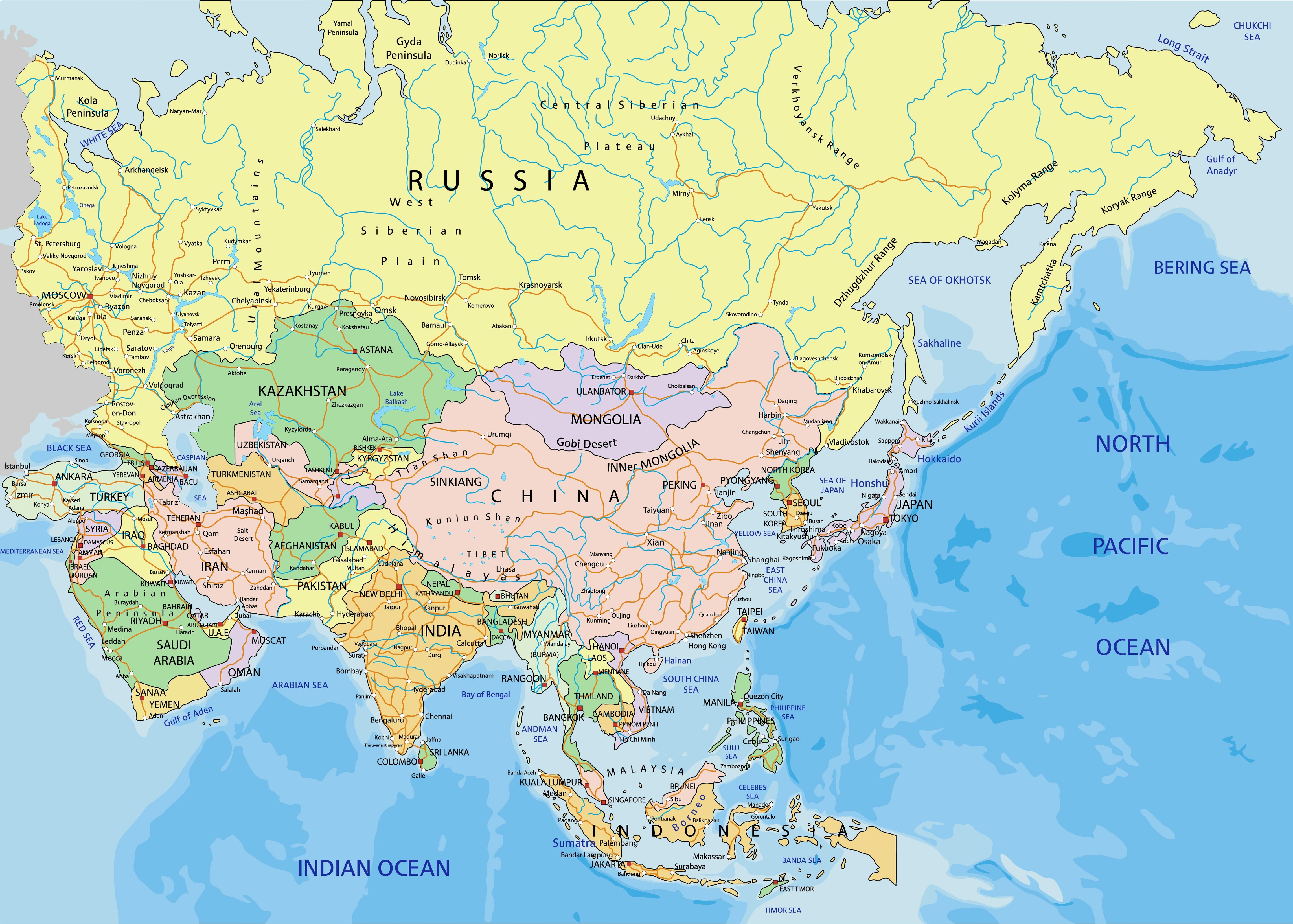 Bild zeigt eine vollständige Karte von Asien inkl. Darstellung aller Grenzen und Landesnamen in Englisch.