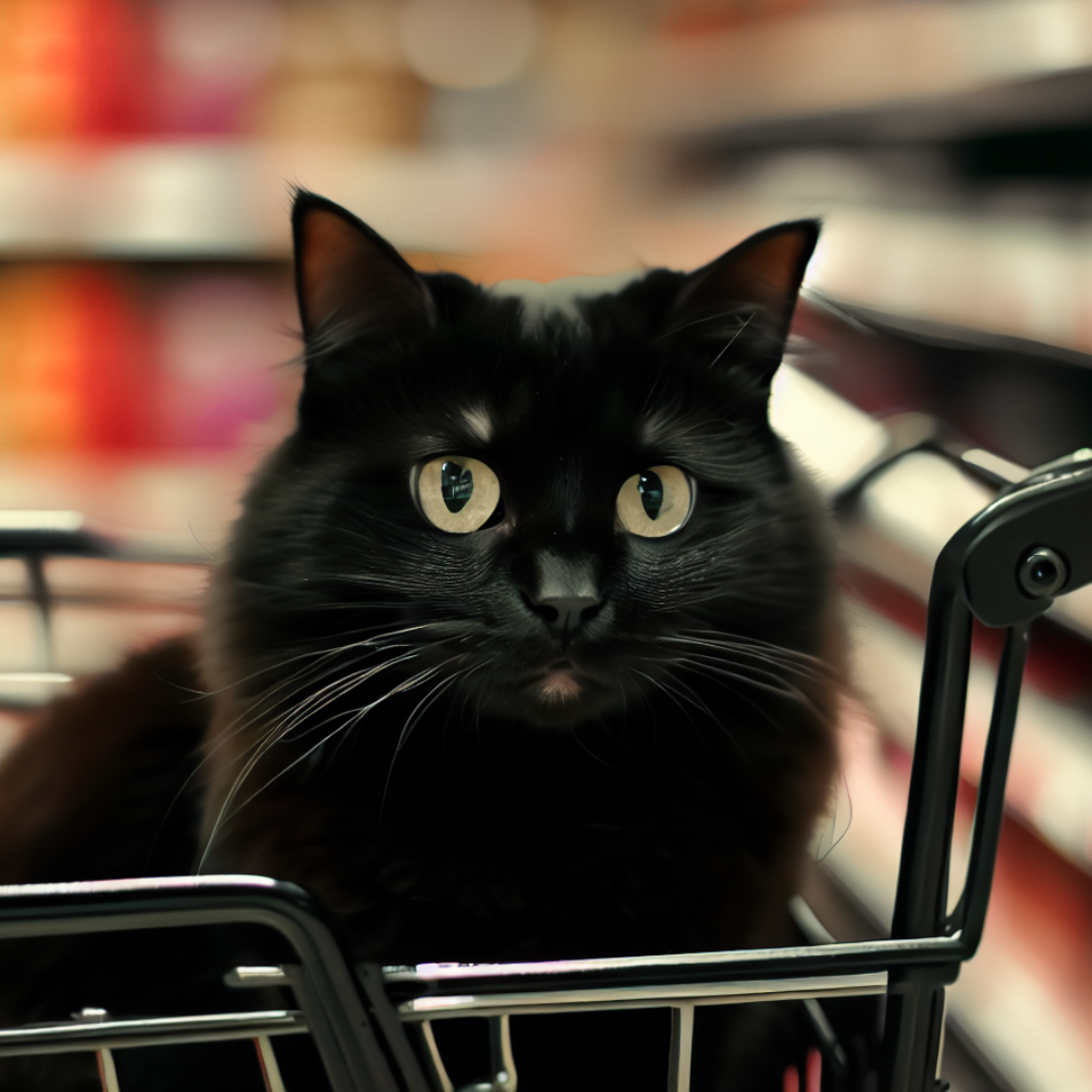 Lustiges Katzenbild mit dem Titel "Katze in kleinem Einkaufswagen".