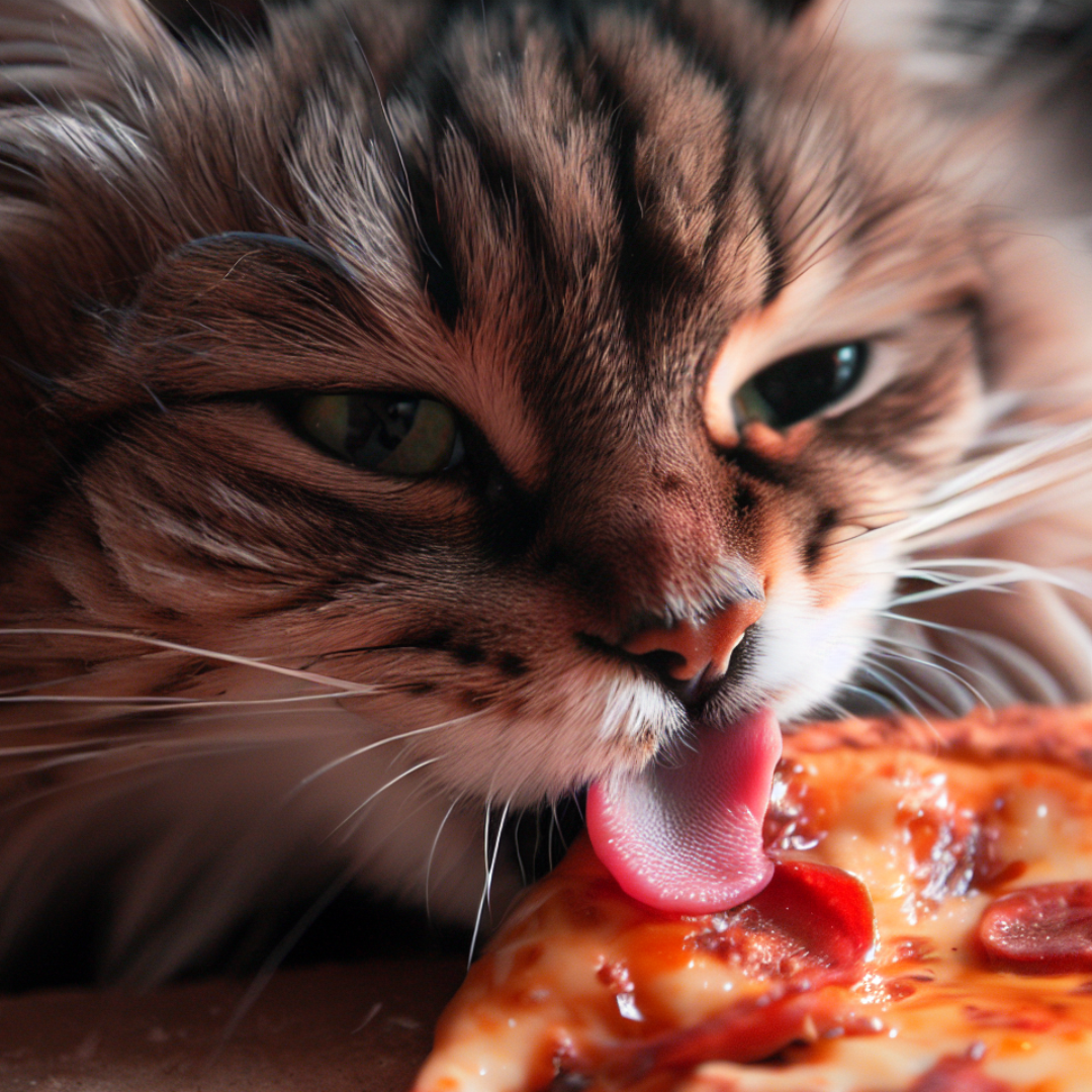 Lustiges Katzenbild mit dem Titel "Katze in Italien? Eine Katze isst eine Pizza.".