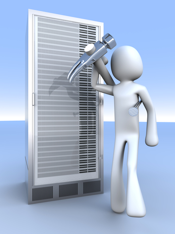 Bild zeigt eine Cartoon-Figur, die einen Server wartet oder repariert.