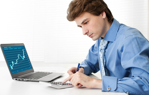 Bild zeigt einen typischen Daytrader/Onlinetrader vor einem PC und Blatt Papier.