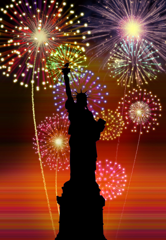 Bild zeigt die Freiheitsstatue mit diversen Feuerwerken zu Silvester (= New Year's Eve in den USA) im Hintergrund.