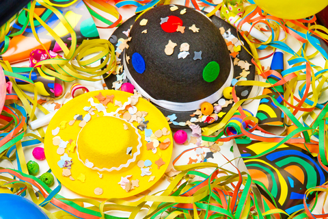 Bild zeigt zwei Hüte und jede Menge Deko zum Thema Fasching und Karneval.