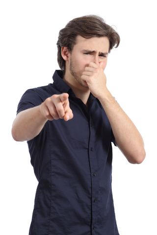 Bild zeigt einen Mann, der jemanden per Zeigefinger auf strengen Geruch (z.B. Schweißgeruch) aufmerksam machen will.