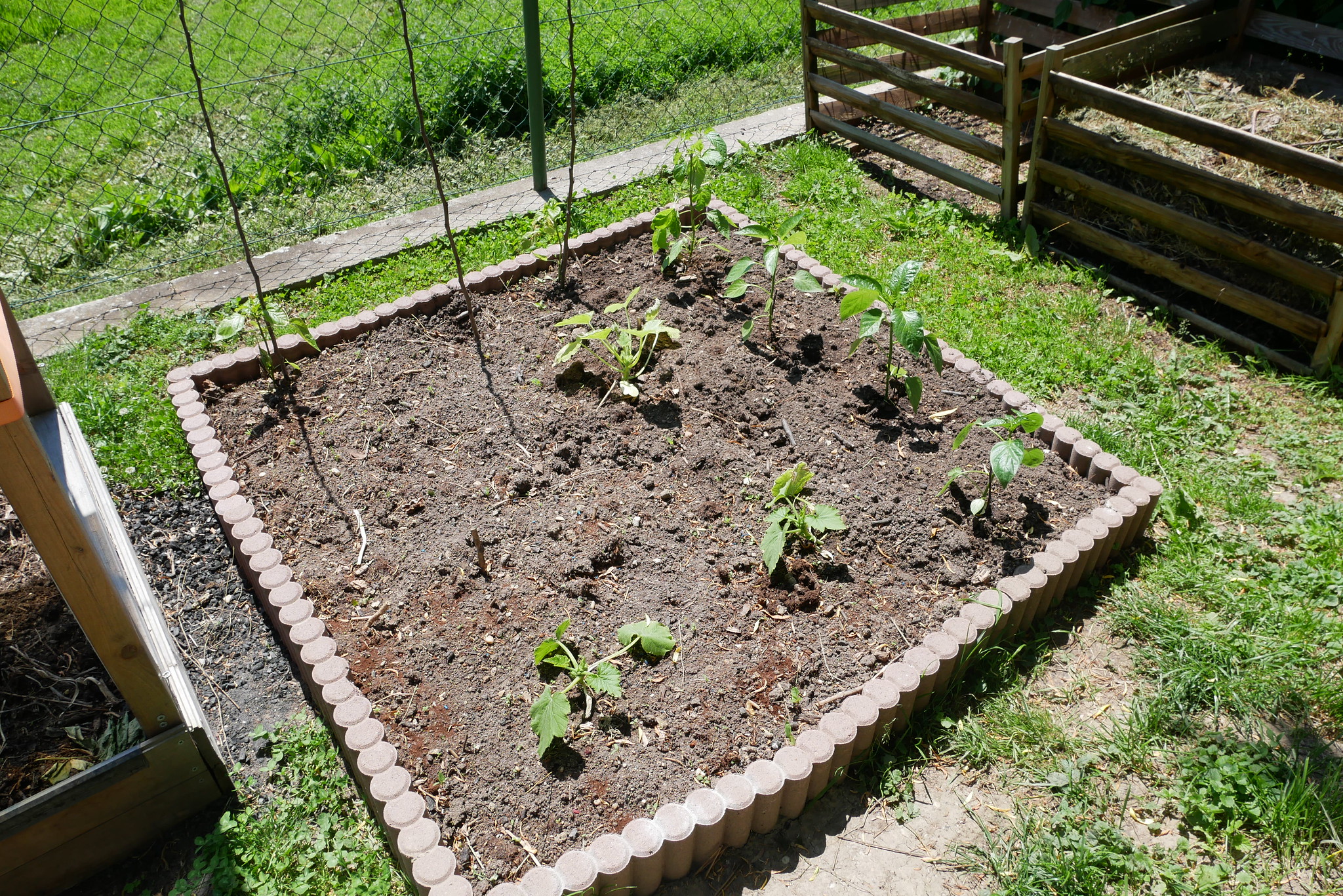 Bild zeigt ein Gemüsebeet im Juni mit jungen Zuccini- und Paprikapflanzen.