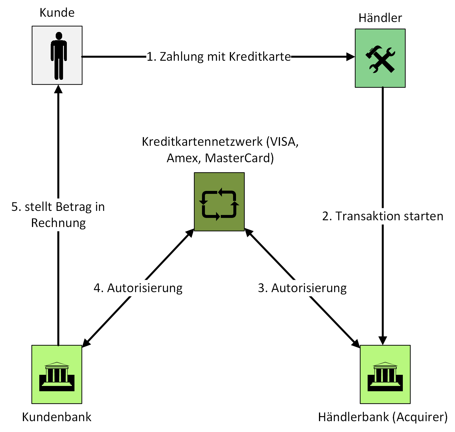 Bild zeigt das 4-Parteien-Zahlsystem bei Zahlung mittels Kreditkarte. Hierbei werden die ersten Schritte der Autorisierung der Zahlung erläutert.