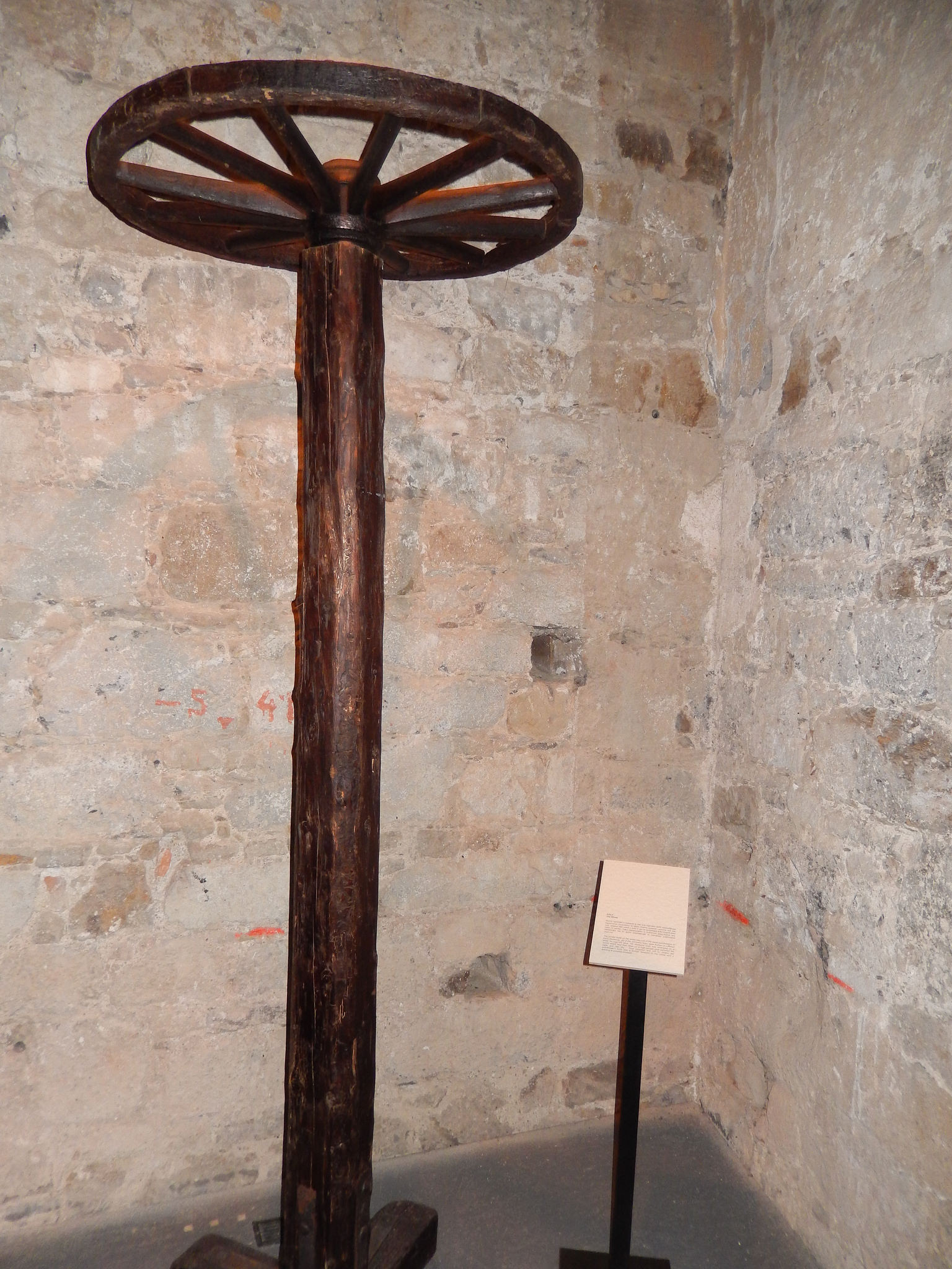 Bild zeigt das Hinrichtungsinstrument "Rädern", welches in einer Ausstellung auf der Burg von Ljubljana in Slowenien gezeigt wird.